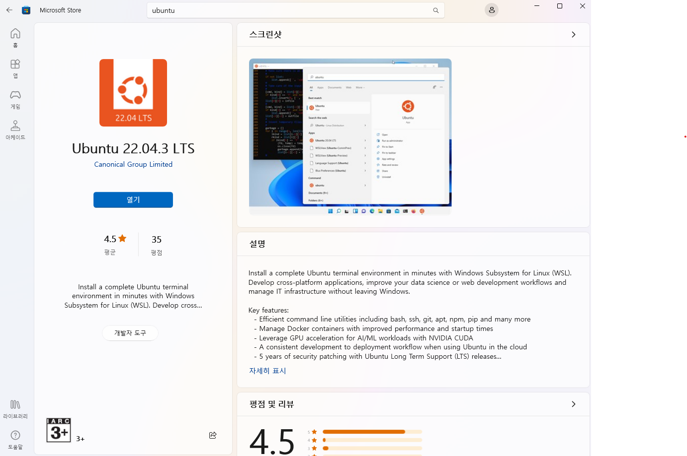 Microsoft Store에 접속해 Ubuntu 22.04 LTS를 설치합니다(다른 버전도 문제 없고 CentOS 등 다른 리눅스를 설치하셔도 됩니다)