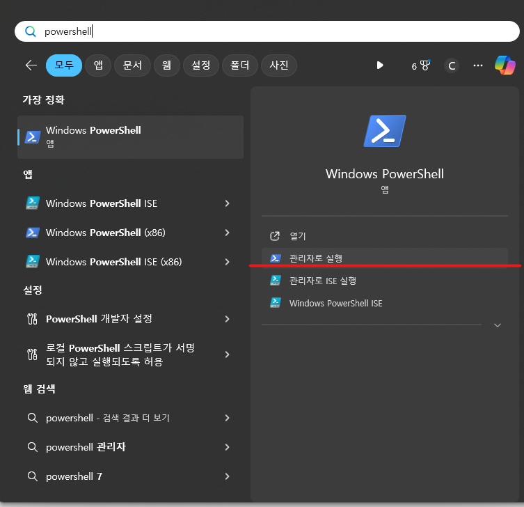 윈도우 Powershell을 관리자 권한으로 실행하여 아래 명령어를 입력합니다