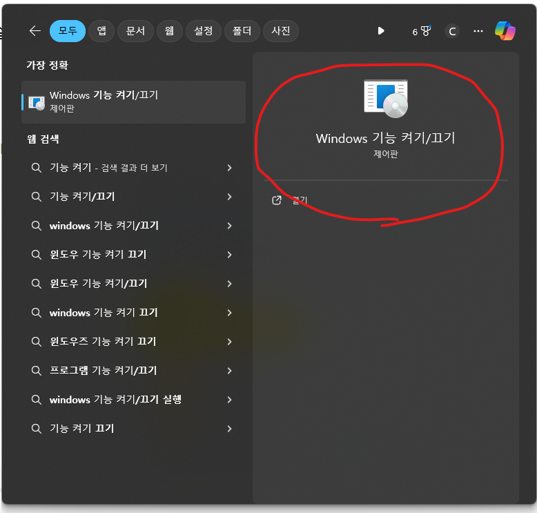 제어판 -> 프로그램 및 기능 -> Windows 기능 켜기/끄기 접속