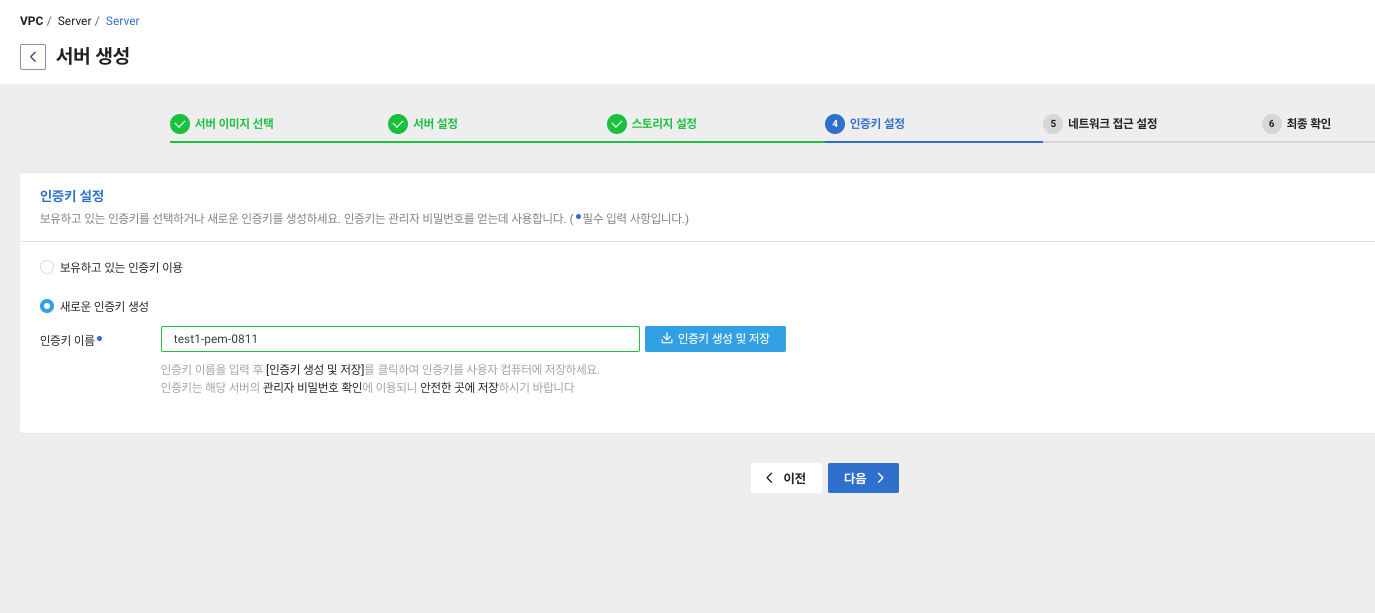 쭉쭉 넘기다보면 "인증키 설정"이 나오게 되는데 기존에 있으시다면 보유하고 있는 인증키를 사용하시고, 아니라면 새로운 인증키를 생성하시면 됩니다. 인증키는 pem 파일이며 후에 서버 인증 과정에 사용됩니다.