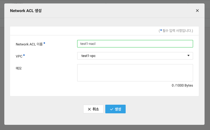 이름은 test1-nacl, VPC는 test1-vpc를 선택합니다.